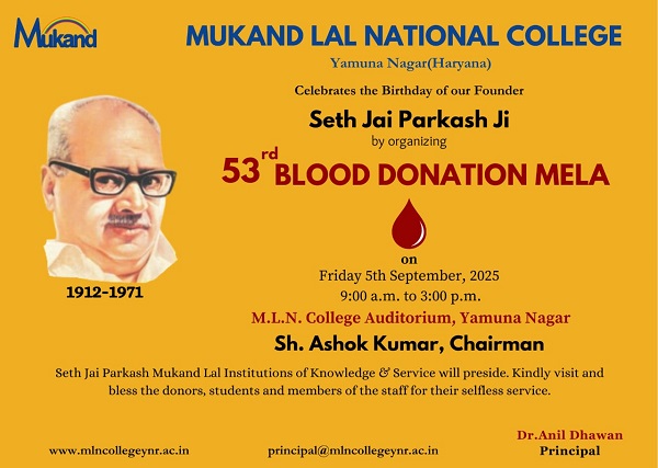This is to inform you all Mukand Lal National College, Yamuna Nagar is going to organize 53rd Blood Donation Mela on 5th September 2025 to celebrate the birth anniversary of our founder Seth Jai Parkash JI. Join us for a Blood Donation Mela and make a difference! Every drop counts - your single donation can save up to three lives. Let’s come together as a community and give the gift of life.