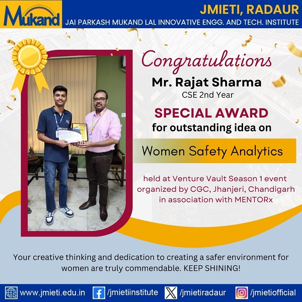 Heartiest congratulations to Mr. Rajat Sharma, CSE 2nd Year student at JMIETI, Radaur on winning the special award for his outstanding idea on Women Safety Analytics at the esteemed event - Venture Vault Season 1 organized by CGC Jhanjeri, Chandigarh, in association with MENTORx where around 40 teams presenting the idea! Your innovative thinking and dedication to creating a safer environment for women are truly commendable. Keep shining!