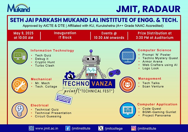 This is to inform you all that JMIT, Radaur will organize Annual Technical Fest - "Technovanza -2k25" in JMIT which is scheduled to be held on 9th May 2025. The program will include various technical events from various departments.
