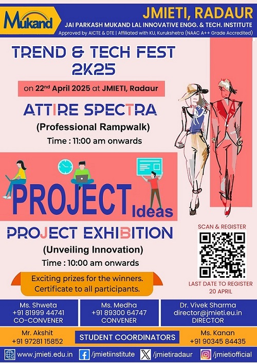 This is to inform you all that JMIETI, Radaur will organize Trend & Tech Fest 2K25 in JMIETI on April 22, 2025. The program will include two events: Attire Spectra (Professional Rampwalk) and Project Exhibition (Unveiling Innovation).